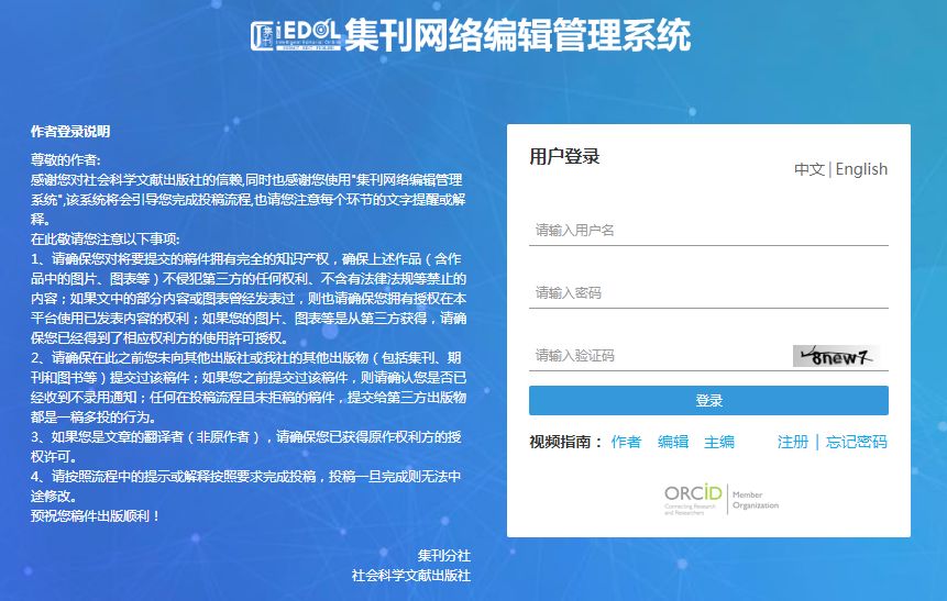 “iEDOL网络编辑管理系统”是作者、编辑部、出版社出版管理部门、分社及编辑部的相关编辑建立文章、文集和图书的投约稿管理的在线智能工作平台,实现在线投稿、学术不端检测、专家评审、稿件审校、稿件授权、组稿、单篇稿件优先发布的完整流程,系统对稿件流转的各环节进行详细记录,使出版相关人员和作者可以实时掌握稿件的进度,并实现作者、编辑部及出版社等各方的在线沟通。