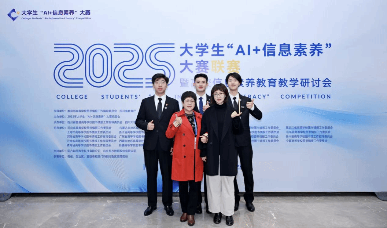 在2025年大学生“AI+信息素养”大赛全国联赛中,我校学子再创佳绩!由我校选送的本科生代表队“超级旺旺队”,凭借扎实的信息素养与人工智能融合应用能力,与来自全国高校及军民融合赛道的50支本科生队伍同台竞技、奋勇争先,最终荣获全国三等奖。同时,我校两位图书馆教师荣获“优秀指导老师”称号,充分体现了我校信息素养教育方面的扎实成效与育人水平。